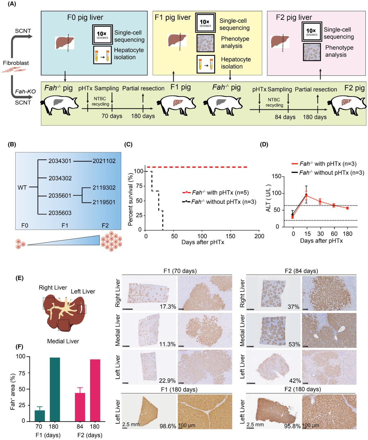 为解决肝细胞移植中的免疫排斥难题,研究团队设计了精妙的实验方案:利用基因编辑技术构建了Fah基因敲除的肝损伤小型猪模型,同时通过体细胞核移植技术制备了与受体遗传背景一致的供体猪,从而在无需免疫抑制的情况下实现同种异体肝细胞的高效移植与再生。